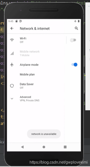 package com.example.broadcasttest;import androidx.appcompat.app.AppCompatActivity;import android.content.BroadcastReceiver;import android.content.Context;import android.content.Intent;import android.content.IntentFilter;import android.os.Bundle;import android.widget.Toast;public class MainActivity extends AppCompatActivity { private IntentFilter intentFilter; //IntentFilter主要用来过滤隐式意图 // 当用户进行一项操作的时候,Android系统会根据配置的 “意图过滤器” 来寻找可以响应该操作的组件,服务。 private NetworkChangeReceiver networkChangeReceiver; //定义一个一个类,让它继承自BroadcastReceiver // 并重写父类的onReceive() 方法,以此创建一个广播接收器 class NetworkChangeReceiver extends BroadcastReceiver{ @Override public void onReceive(Context context, Intent intent) { //采用Toast来发送消息 Toast.makeText(context, "network changes", Toast.LENGTH_SHORT).show(); //通过静态方法makeText() 创建出一个Toast对象 //并通过show()将Toast显示出来 // makeText() 方法需要传入3个参数。 // 第一个参数是Context ,也就是Toast要求的上下文,活动本身就是一个Context 对象。 // 第二个参数是Toast显示的文本内容, // 第三个参数是Toast显示的时长,有两个内置常量可以选择Toast.LENGTH_SHORT 和Toast.LENGTH_LONG } } //完成该activity各种初始化操作,如加载布局、绑定事件等 @Override protected void onCreate(Bundle savedInstanceState) { super.onCreate(savedInstanceState); setContentView(R.layout.activity_main); //Intent所传递的信息 intentFilter=new IntentFilter();//首先创建一个IntentFilter 的实例 intentFilter.addAction("android.net.conn.CONNECTIVITY_CHANGE");//给其添加一个action //当网络的状态发生变化时,系统所发出的,正是上面名称的广播 //广播接收器 networkChangeReceiver = new NetworkChangeReceiver();//创建了一个NetworkChangeReceiver 的实例 registerReceiver(networkChangeReceiver, intentFilter); //调用registerReceiver() 方法进行注册 //将NetworkChangeReceiver 的实例和IntentFilter的实例(即上面的信息)都传了进去 } //动态注册的广播接收器一定都要取消注册 @Override protected void onDestroy() { super.onDestroy(); unregisterReceiver(networkChangeReceiver); //通过调用unregisterReceiver() 方法来实现networkChangeReceiver广播的取消注册 }} 运行一下程序。首先你会在注册完成的时候收到一条广播,然后按下Home键回到主界面(注意不能按Back键,否则onDestroy() 方法会执行),接着打开Settings程序→Data usage进入到数据使用详情界面,然后尝试着开关Cellular data按钮来启动和禁用网络,你就会看到有Toast提醒你网络发生了变化。