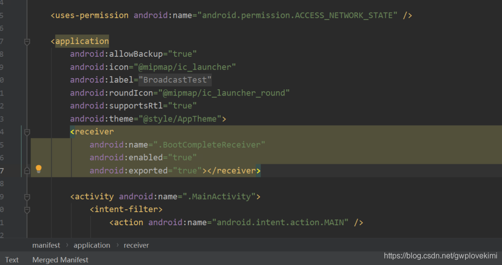 <application> 标签内出现了一个新的标签<receiver> ,所有静态的广播接收器都是在这里进行注册的。它的用法其实和<activity> 标签非常相似,也是通过android:name 来指定具体注册哪一个广播接收器,而enabled 和exported 属性则是根据上面勾选的状态自动生成的。